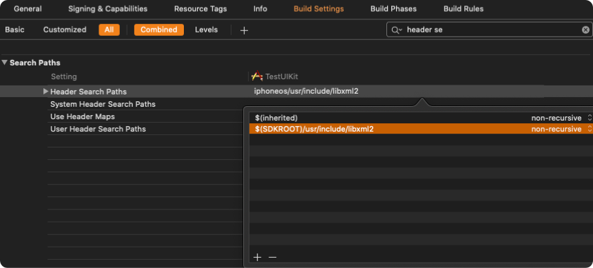 Set theHeader Search Paths to $SDKROOT/usr/include/libxml2.